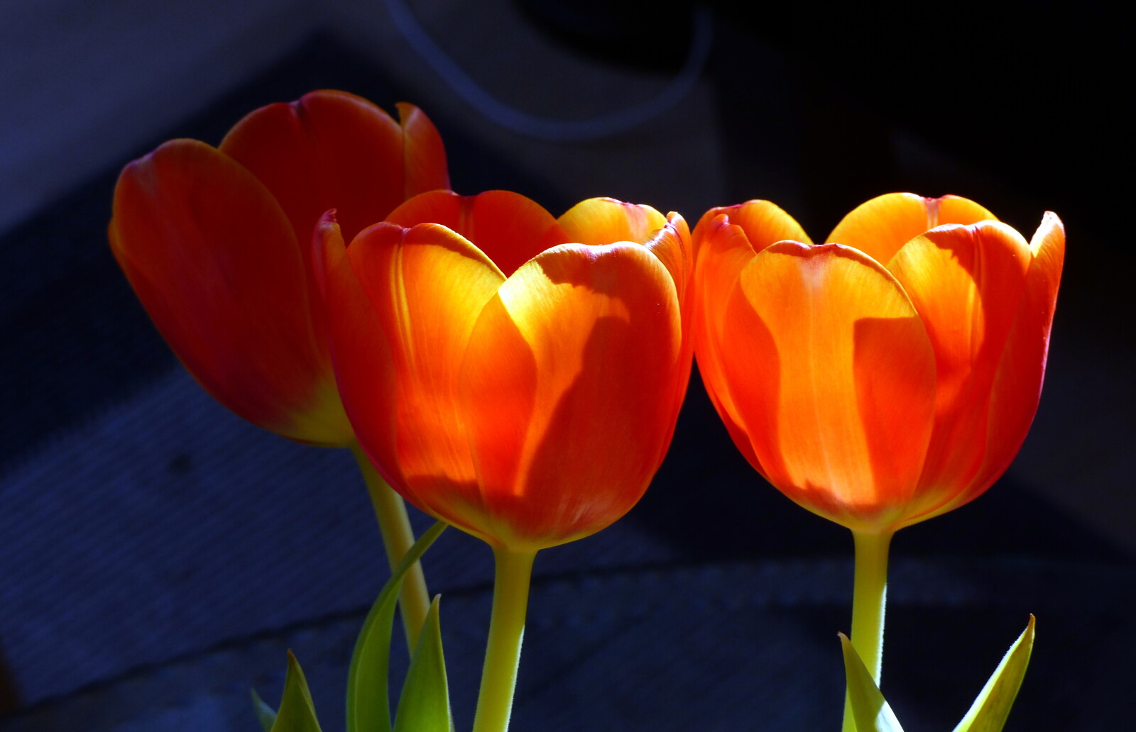 Gennem vinduet rammer den blege vintersols stråler fruens buket i stuen. Nu står tulipanerne som lysende lygter. Grøn strøm!