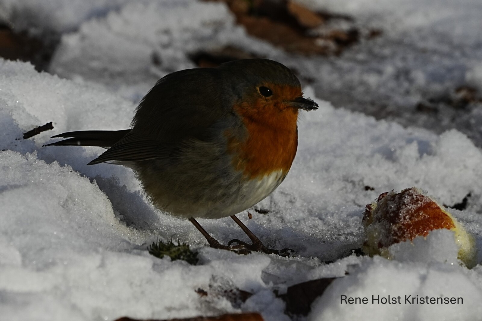 Rødkælk spiser æble i skoven