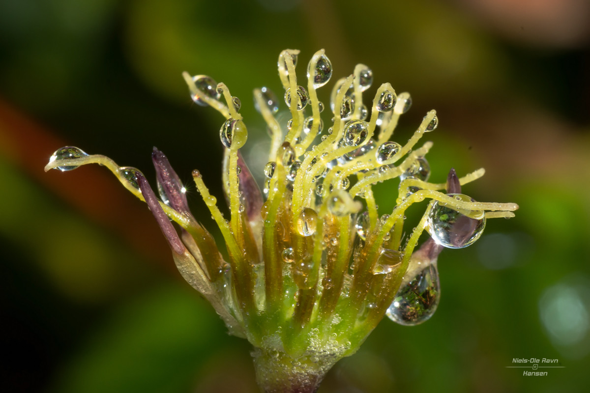 Her har duggen lagt sig på frøstanden af clematis