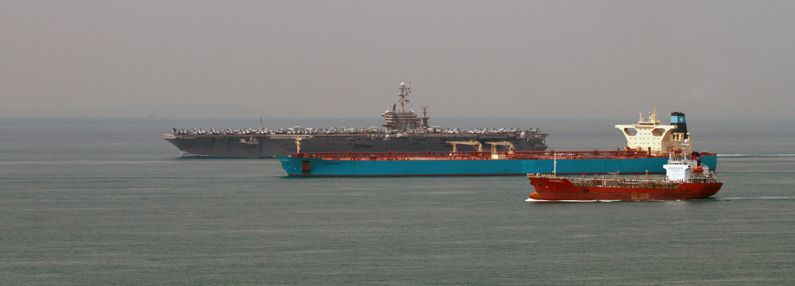 USS John C. Stennis (333 m), Maersk Eli (333 m), Fatmawati (108 m) - I Singapore Strædet