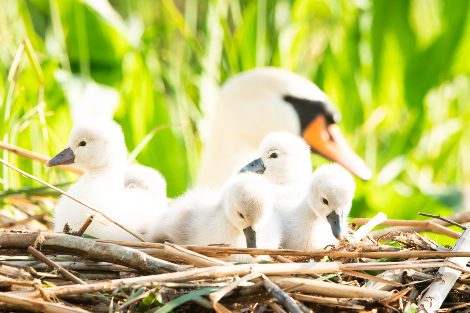 Ofte var jeg på besøg i reden og de sidste 10-14 dage var jeg der som minimum 2 gange dagligt. En smule nervøs var jeg da der ikke rigtig skete noget. Kunne det meget kolde forår have haft indflydelse og måske ødelagt rugningen !? De sidste dage kunne jeg mærke en ændring i svanemors adfærd. Hun virkede nervøs og jeg valgte derfor at være der alle de timer jeg nu kunne. Så skete det. Ungerne kom én efter én. 6 stk. ud af de 8 æg.