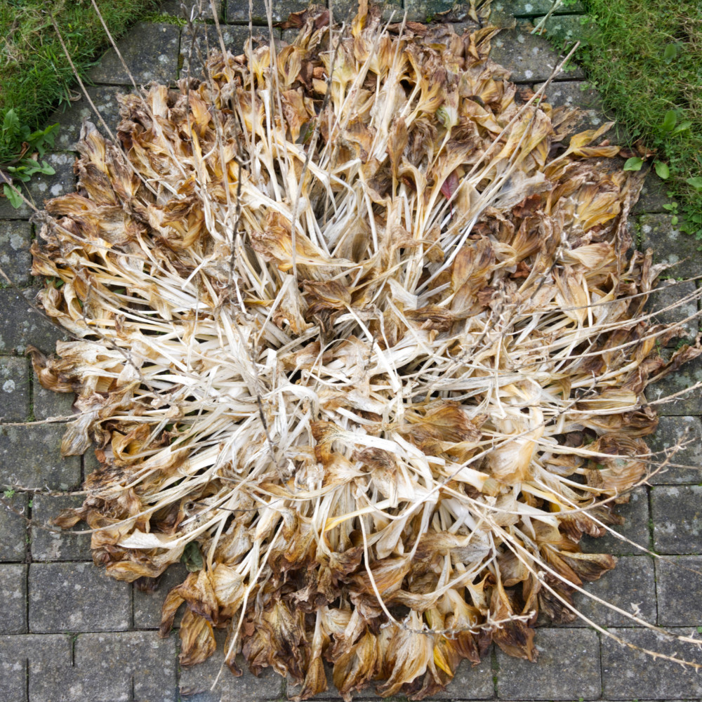 En Hosta plante er visnet hen i efteråret